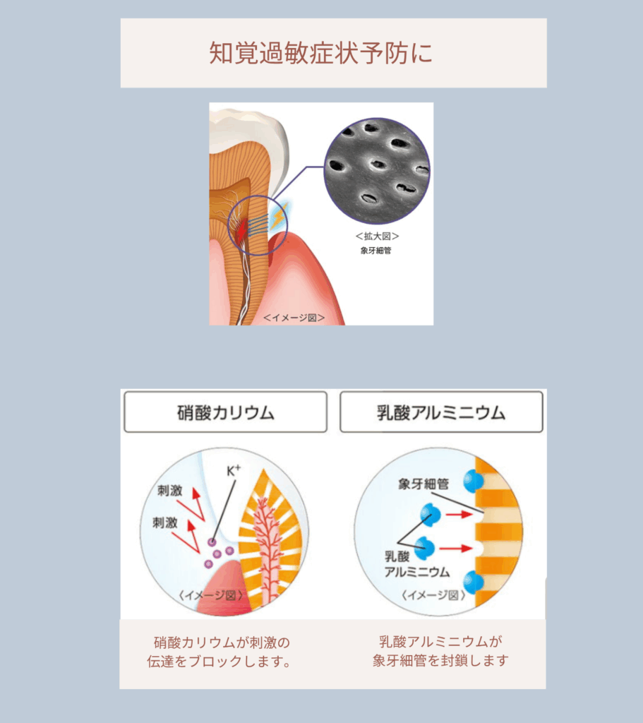 冷たいものを控えたり、知覚過敏用の歯磨き粉を使うと軽減します。知覚過敏に効果のある硝酸カリウムや乳酸アルミニウムなどが配合された歯磨き粉を使用しましょう。